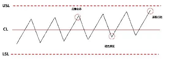在完成过程分析后,若判定过程稳定且过程能力可接受,那么,就进入控制状态(先将控制线画在控制图中,然后依抽样的结果在控制图上进行描点监控),此时控制图的控制线,是过程分析改进、判定完成后,最终的分析数据控制线延长,用于过程控制的。