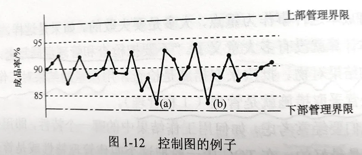 除了生产量、成本、成品率,其他相当于检查点的特性值都可以在管理图上标点。因此,各级管理负责人使用管理图就很容易执行自己的管理职责。但是管理图只能表示出异常的存在而不能表示出原因的所在,我们需要找出异常原因之后,把它消除掉才行。如图中表示的是处于受控状态的管理图的一个例子,平均成品率在90%时,像a点和b点那样出现在83.5%的成品率数值时,你会责备下属吗?工作现场像平常一样地工作着,但也会出现这样的数据。